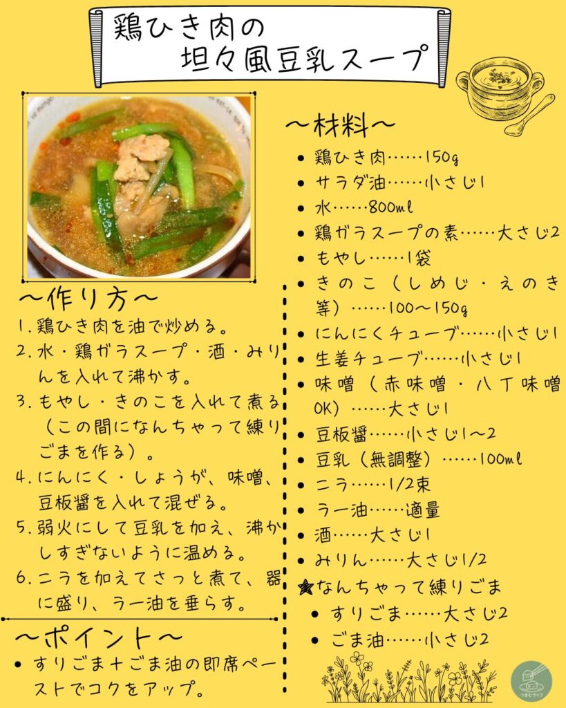 今日は、あっという間に作れるのにコクたっぷりの「坦々風豆乳スープ」。